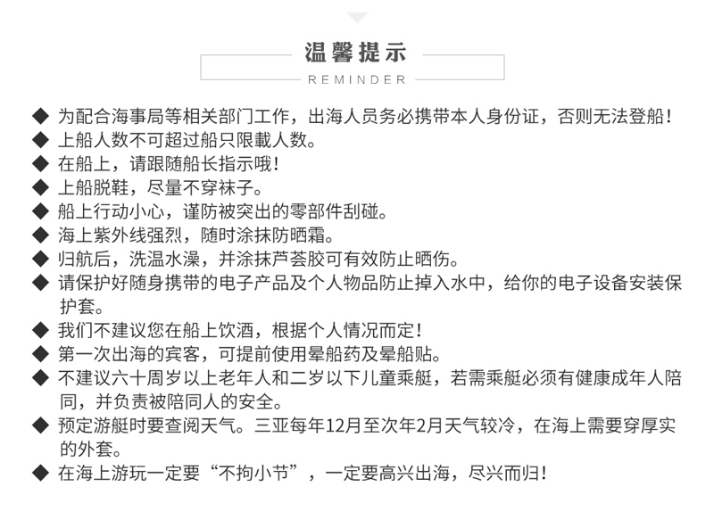 | 選配項目: | 摩托艇、飛魚、香蕉船、水上飛行器、飛拖、滑板 | ||||||