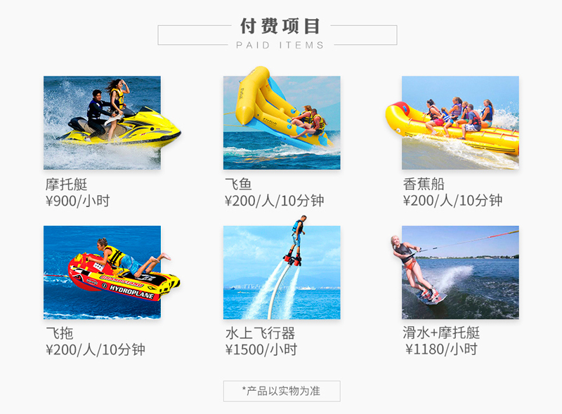 | 選配項(xiàng)目: | 摩托艇、飛魚、香蕉船、水上飛行器、飛拖、滑板 | ||||||